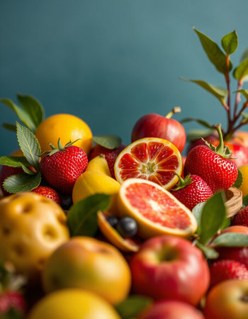 Variety of fresh fruits including strawberries, oranges, lemons, grapefruits, apples and oranges.