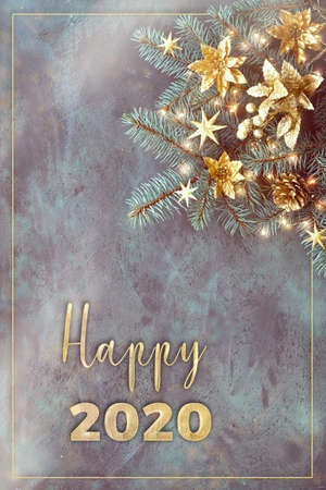 Happy New Year 2020 banner with golden blue colors and graphic elements. Glowing backdrop, space for text