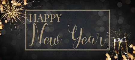 2022 Happy New Year, New Year's Eve Party, festive celebration holiday greeting card background banner illustration template - Golden frame with lettering typography, fireworks and champagnes glasses toasting, on abstract black night sky with bokeh lights flares