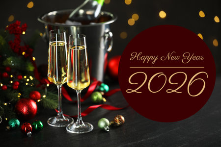 Happy New Year 2026 greeting card with glasses of sparkling wine and Christmas decor on dark background, bokeh lights