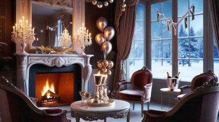 A festive New Years Eve scene featuring a large clock, golden ornaments, gift boxes, and fireworks, symbolizing the countdown to midnight.