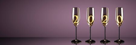 Glasses of champagne, figure 2020 and Christmas decor on color background
