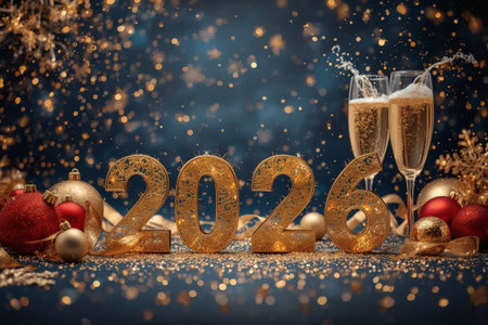 Banner. Shiny gold numbers 2026 and glasses splattered with champagne and a beautiful bokeh on a blue background. Happy New Year and Christmas.
