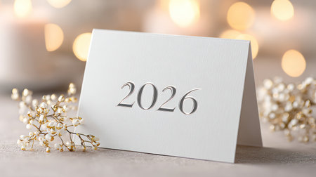 Clean white textured card with gray 2026 typography on wooden table with green plants and bokeh lights.