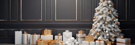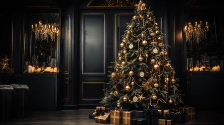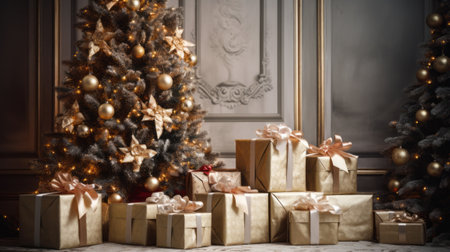 Christmas tree in classic interior with gold decorations and presents. 3d render