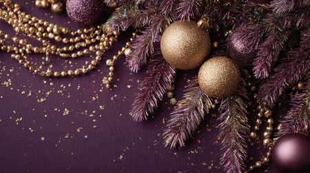 A stunning arrangement of elegant purple and gold Christmas ornaments and pine branches on a deep purple background creates a warm and festive atmosphere.