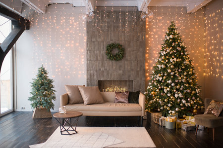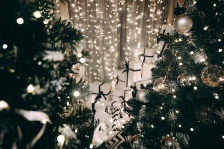 Christmas decorations lights. Modern New Years decor. Christmas trees with garlands and gifts.