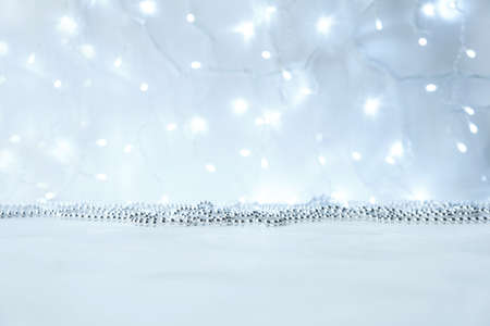 New year and Christmas background with silver garlands with lights with bokeh in blur. Gray neutral colors with copy space and mock up.