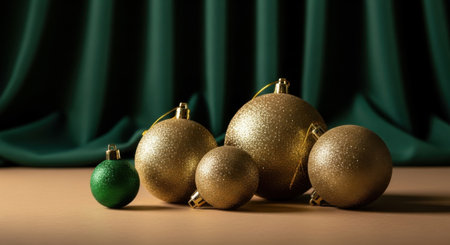 A collection of golden and green Christmas ornaments of different sizes, arranged on a surface with a green curtain in the background.