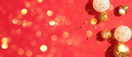 Christmas composition. Flat lay, top view. Disco ball bauble, star sparkles. Minimal New year party concept. Christmas white and gold decorations on red background with copy space