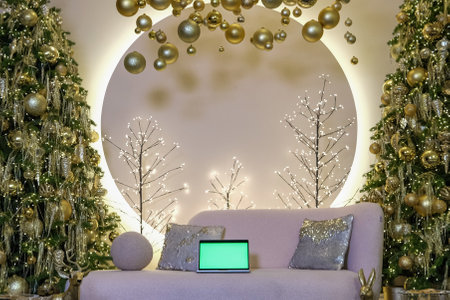 Open laptop against the background of New Years decorations