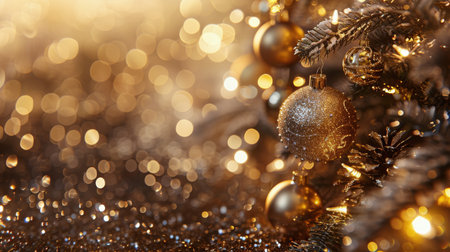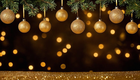 Golden, glitter-covered Christmas ornaments hang from a dark green pine branch against a dark background filled with soft, blurred golden bokeh lights. The foreground a shimmering golden glitter surface.