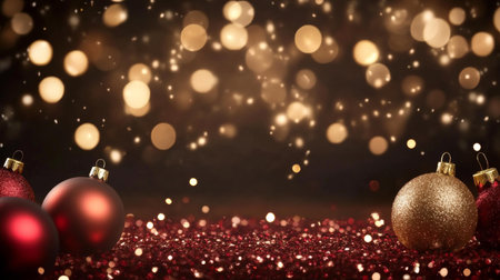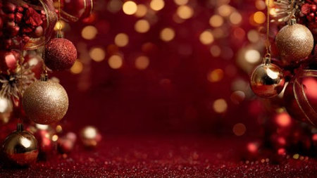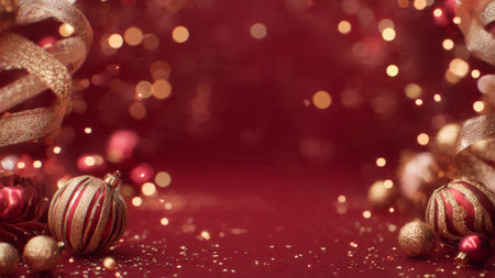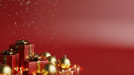 The a festive holiday scene with red Christmas gifts wrapped in shiny paper and adorned with gold bows. Gold ornaments and strings of lights are scattered around the gifts, creating a warm and cheerful atmosphere. The background is a deep red with sparkling confetti, enhancing the celebratory mood. The composition is vibrant and inviting, capturing the essence of the holiday season.