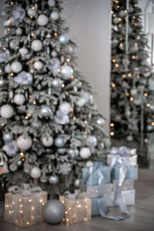 Christmas tree on blur background of christmas decorated interior. copy space for text