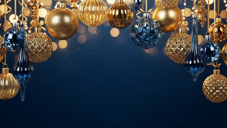Christmas and New Year background with golden and blue christmas balls. 3d rendering