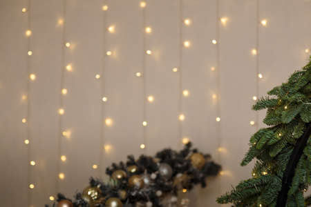 Soft focused shot of fir branches on festive Merry Christmas and Happy New Year background. Warm golden garland lights bokeh. Winter holidays template, copy space