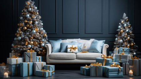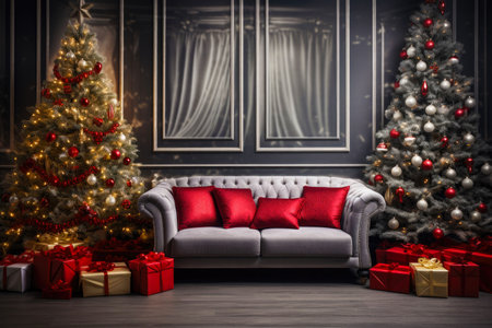 Christmas background with Christmas tree, gifts and sofa against a wall