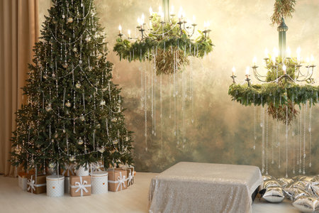 Christmas living room interior with Christmas tree and decorations. new year holiday concept