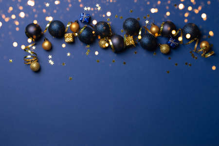 Beautiful gold silver decorations Christmas toys on a dark blue background