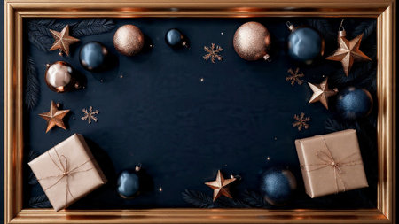 Christmas and New Year greeting card. Gold frame with christmas decorations and gift box on black background.
