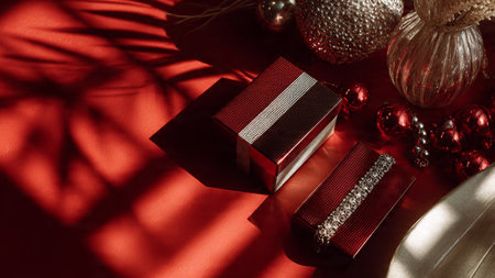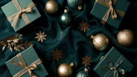 Overhead shot of lavish gift boxes in silver wrapping, surrounded by opulent tree ornaments, on a dark emerald green backdrop with space for messages. The scene exudes holiday elegance and refinement.