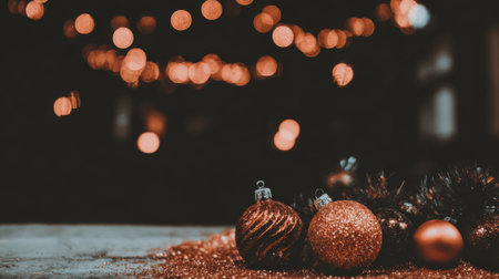 Close-up of Christmas ornaments and lights creating a warm, festive atmosphere on a rustic wooden surface. Perfect for holiday-themed designs.