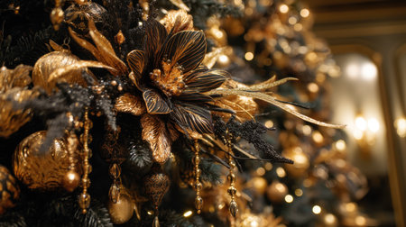 This stunning closeup features a luxurious floral decoration in gold and black, enhancing a beautifully adorned Christmas tree with sparkling lights.