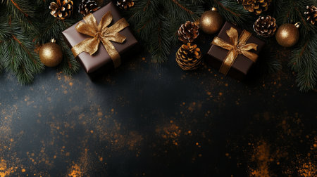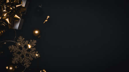 Christmas and New Year greeting card. Gold frame with christmas decorations and gift box on black background.