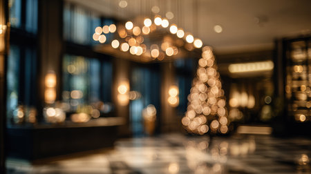 Warm seasonal hotel setting with glowing Christmas decor softened by bokeh lights..