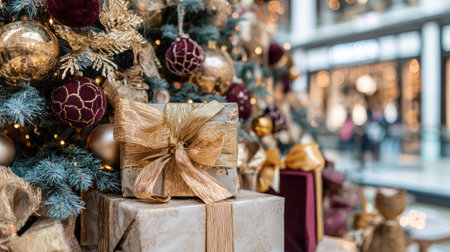 A close-up view presents a decorated Christmas tree with various ornaments and wrapped gift boxes. The composition showcases golden and burgundy tones with soft lighting. This festive scene evokes a sense of celebration and joy, suitable for commercial projects, seasonal campaigns and holiday marketing.