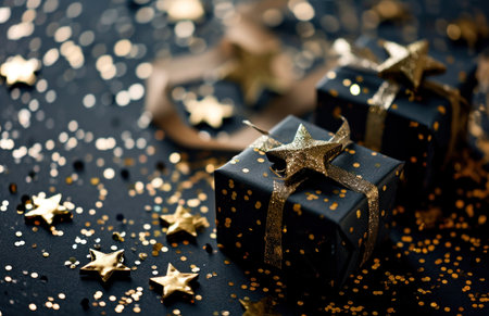 Black glitter background with subtle silver sparkles, offering a sophisticated and modern look for gift wrapping. Fathers day celebration.