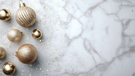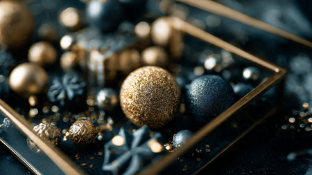 Stunning display of Christmas ornaments and decorations featuring a golden tree, shimmering baubles, and a blue marble gift box, perfect for holiday joy.