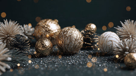 Close-up of sparkling golden Christmas ornaments, creating a festive and luxurious atmosphere. Perfect for holiday cards.