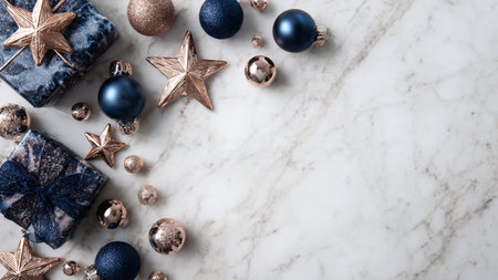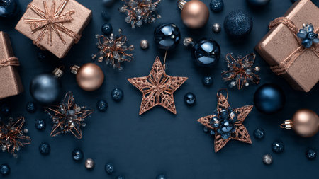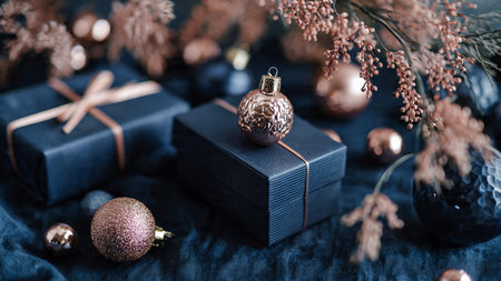 A soft-lit holiday mockup highlighting refined rose-gold ornaments arranged over deep blue tones.