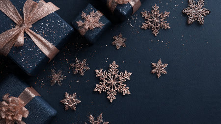 A top view of luxurious gift packages in gold and black, adorned with elaborate bows, nestled among elegant tree trimmings and crystal ornaments. The overall look is festive and opulent.