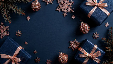 A symmetrical frame of matte blue decorations and shimmering rose-gold accents for a premium Christmas look.