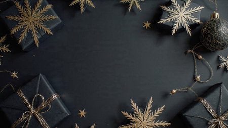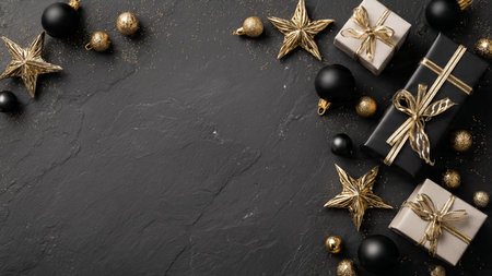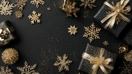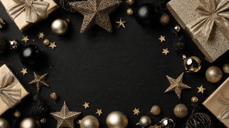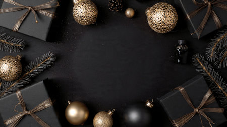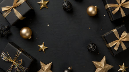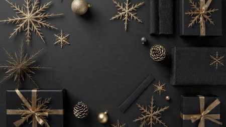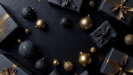Gold-wrapped gifts and ornaments arranged on a clean matte-black flatlay scene.