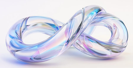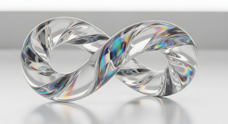 A clean, modern 3D render of a glass infinity symbol on a reflective white surface. The symbol has a twisted, crystalline structure that refracts light, creating beautiful, colorful iridescent and holographic caustics, representing concepts of eternity and endless possibilities.