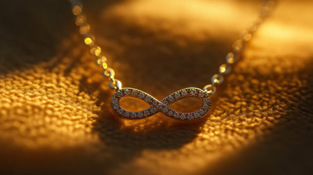Captivating close-up shot of an infinity necklace adorned with sparkling gemstones, showcasing its elegance against a warm, softly lit background.