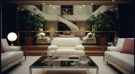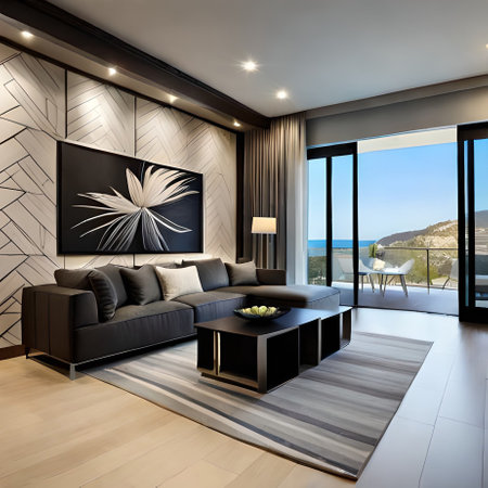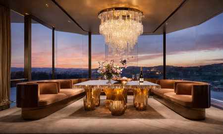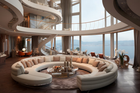 Luxury modern living room with sea view in the evening.