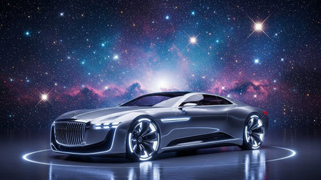 A sleek, futuristic silver concept car is presented against a backdrop of a vibrant nebula and a starry expanse. The vehicle sharp, aerodynamic lines and is accentuated by glowing neon blue and white trim along its body and wheels. A luminous blue circle surrounds the car, suggesting a futuristic display or energy field. The overall impression is one of advanced technology and aspirational set within the vastness of the cosmos.