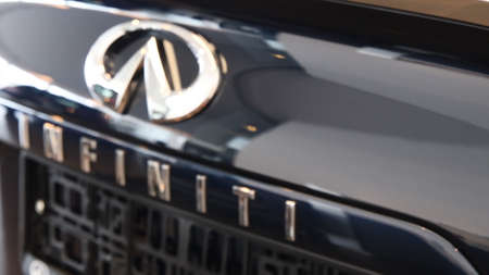 Kharkov, Ukraine - September 13, 2021: Infiniti brand logo on a black car background, emblem, symbol close-up