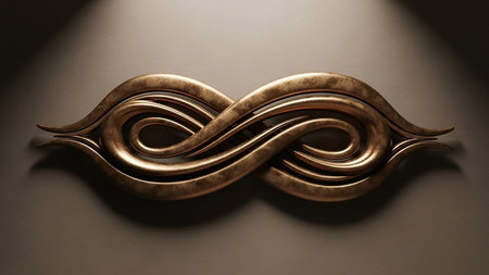 A metallic bronze infinity symbol with smoothly intertwined curves, dramatically lit against a textured, shadowed background.