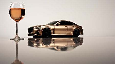 a man holding a glass of wine sits at a table with an ornamental silver car. the photo showcases a sleek metallic finish and a streamlined design, reminiscent of the golden ratio. the image is enhanced with airbrushing techniques, resulting in a stunning visual. this masterpiece by range murata is captured in high-resolution 8k quality. ai generated