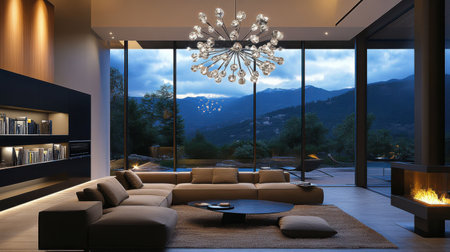 This modern living room showcases a spacious layout with cozy seating, an artistic chandelier, and large windows offering breathtaking mountain views as dusk settlements.