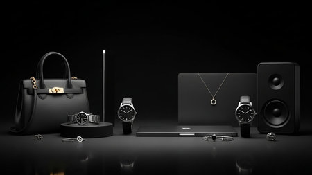 A collection of luxury black accessories including a handbag, watches, laptop, necklace, and speaker are artfully arranged on a dark reflective surface.