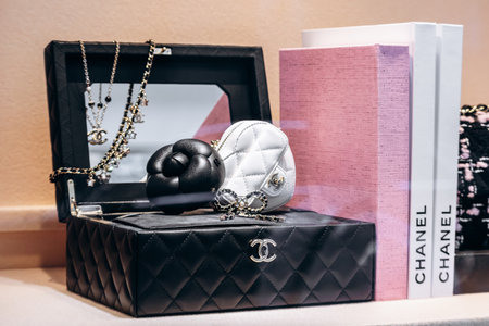Paris, France - September 7, 2025: Chanel boutique window displays with designer handbags and luxury accessories on Rue Cambon