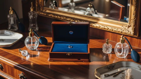 A high angle cinematic wide shot of an open, antique mahogany jewelry box, centered on a dark wood v