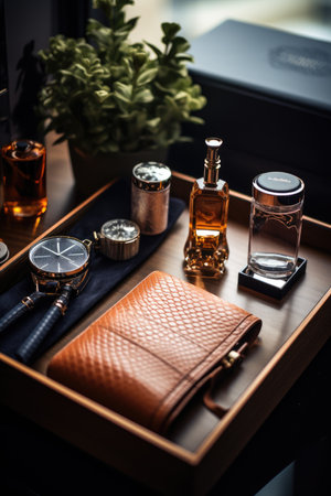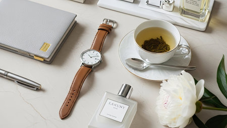 An overhead shot showcases a wristwatch, teacup, and various accessories arranged on a light-colored surface. The composition features a leather strap watch alongside a pen, a notebook, and a perfume bottle. The image is bathed in soft lighting, highlighting the textures and the overall aesthetic, which is suitable for lifestyle and business related content.