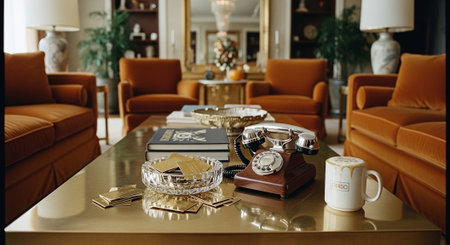 A stylish living room featuring orange velvet sofas, a vintage rotary phone, a coffee table with gold accents, and decorative items